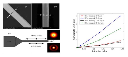 光互聯及光信號處理團隊的張新亮教授、張羽博士等人提出了在微納光纖中引入更加精細的周期性結構,并且據此和新加坡南洋理工大學沈平教授、林波等合作制作了微納光纖布拉格光柵(MFBG)這一新穎的器件。該器件采用248nm的KrF準分子激光器,借助相位掩模板,在直徑為微米量級的具有光敏性的微納光纖上刻制了折射率周期性變化的布拉格光柵。MFBG具有不同于普通光纖布拉格光柵(FBG)的獨特的反射特性,在其反射譜中,除了具有對應基模的反射峰(類似于普通FBG)外,還有對應于高階模式的反射峰;并且高階模式的反射峰具有靈敏度很高的折射率傳感特性,在實驗中獲得了102nm/RIU的傳感靈敏度。