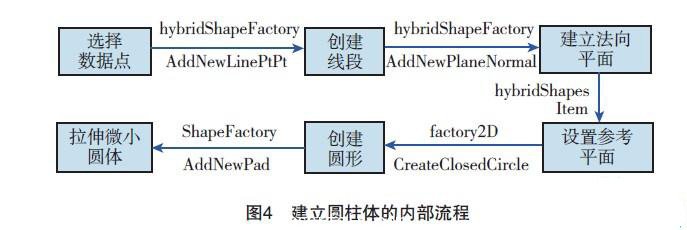 為此,本課題采用了以下辦法:(1)采用進(jìn)程外應(yīng)用方式[7],運(yùn)用GetObject方法將CATIA作為一個對象連接與嵌入(Object Linking and Embedding, OLE),調(diào)用給VB程序應(yīng)用;(2)利用VB程序的循環(huán)語句控制CATIA中的內(nèi)部函數(shù),在所有的OTP點與激光跟蹤儀數(shù)據(jù)點之間建立線段,并以線段為 中心軸,生成一個截面積很小(本系統(tǒng)中為0.01mm2)的圓柱體以等效代替光線,該步程序內(nèi)部流程見圖4;(3)利用CATIA V5電子樣機(jī)(Digital Mock-Up, DMU)模塊中的空間分析(Space Analysis)功能,選擇圓柱體與型架模型進(jìn)行干涉分析,并返回檢測結(jié)果。這個功能的具體流程見圖5。