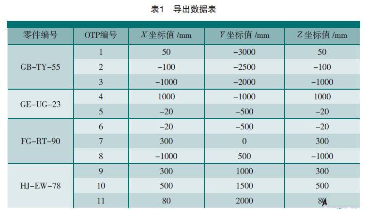 基于光學(xué)目標(biāo)點數(shù)字化設(shè)計系統(tǒng)建立合理的OTP點之后,需要進(jìn)行激光跟蹤儀的設(shè)站工作,采用激光跟蹤儀設(shè)站優(yōu)化系統(tǒng)對設(shè)站數(shù)據(jù)點進(jìn)行求解尋優(yōu)前,需要輸 入OTP的三維空間坐標(biāo),由于OTP點數(shù)量很多,依靠人工讀取效率很低,為此,本課題開發(fā)了大量數(shù)據(jù)點的導(dǎo)出功能,選取相應(yīng)的數(shù)據(jù)點,輸出的數(shù)據(jù)如表1所 示。