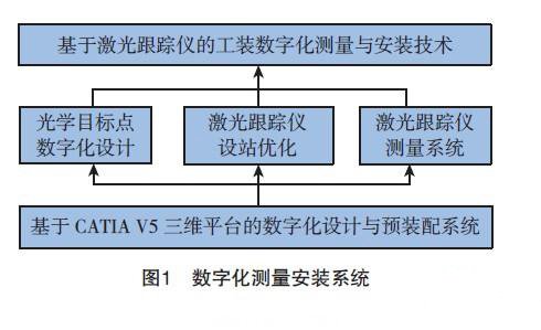 基于激光跟蹤儀的工裝數(shù)字化測量與安裝技術(shù)主要包括4個系統(tǒng):數(shù)字化建模與裝配、光學(xué)目標(biāo)點數(shù)字化設(shè)計、激光跟蹤儀設(shè)站優(yōu)化[5]及激光跟蹤儀數(shù)字化測量(見圖1)。