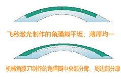 用飛秒激光制作的角膜瓣不會出現紐扣瓣、游離、破碎等情況,角膜瓣厚度各處相同,均勻一致;而微型角膜刀制作的角膜瓣一般都存在周邊部稍厚,中央部較薄的情況,很難做到中央部與周邊部厚度一樣的板層角膜瓣,因此角膜刀切瓣的術后復位固著性不好。