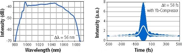 我們以Menlosystems公司摻Yb光纖激光器(中心波長1030nm)很為例,在鎖模狀態下,擁有56nm的寬光譜(FWHM)和58fs的脈沖寬度。這使其將獲得更強的色散和非線性效應,從而通過非線性光纖能夠獲得更大的光譜展寬。