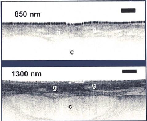 第一,人體細胞對850nm以下的光,有較強的散射,而細胞中的水份對1500nm以上的光,吸收率又較高,這兩點都對OCT的應用極其不利,因此,通常OCT的光源都要求波長在850-1600nm之間。圖3分別顯示了850nm和1300nm下的喉部軟骨組織OCT影像。1300nm下的圖象明顯更清晰。#p#分頁標題#e#