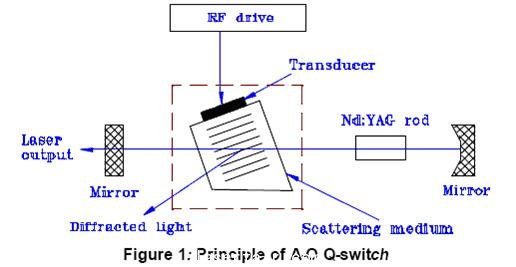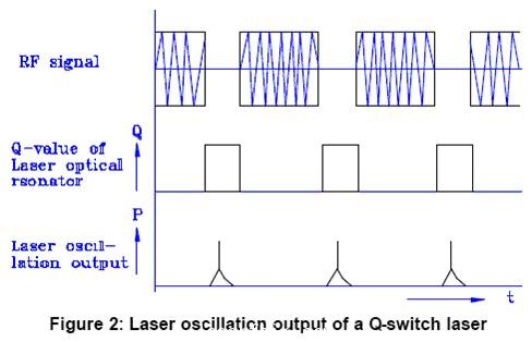 如果激光光學諧振腔的建成是相對于0維衍射光(非衍射光), 當射頻信號被感知,衍射光便從激光光學諧振腔軸線產生. 結果,激光光學諧振腔內發生損失,及激光振蕩受到打壓. 利用這一現象, 射頻信號只在特定某個時間長度內被感知,(地位低Q值)來暫停激光振蕩. 在此期間,反轉的Nd:YAG激光棒通過連續泵浦積累了很多. 當射頻信號減至零(地位高Q值)和激光光學諧振腔內的損失消除了, 累積的能量以在極短的時間長度內脈沖形式的激光振蕩被激活,. 他們是Q開關脈沖.