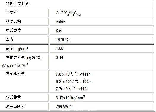 摻鉻釔鋁石榴石(Cr4+:YAG)是一種性能極佳的用于釹釔鋁石榴石、摻釹YLF、摻釹釩酸釔和其它波長在0.8到1.2μm的摻釹或摻鐿激光器的被動調Q開關的晶體。通過被動調Q開關或飽和吸收體在無需電光開關的情況下能得到充足的激光脈沖,因此減小了尺寸,排除了供給高壓能量的需要。它將在被動調Q開關領域取代通常使用的LiF和染料而成為1um摻Nd激光器的優良選擇。