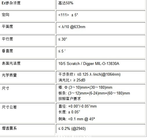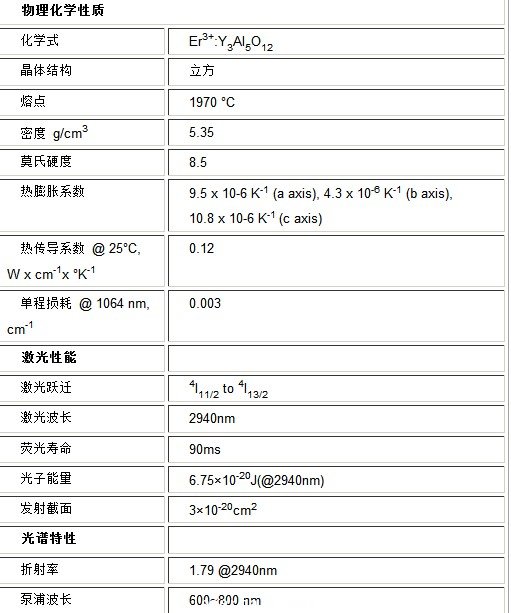 | Er:YAG晶體是一種優良的 2.94μm 激光晶體,廣泛應用于激光醫療系統及其它領 域。 Er:YAG 晶體是3mm 激光最重要的工作物質。水對 3mm 波長光的吸收系數比 2mm 大 100 倍,比 1mm 大 100 倍,因此 3mm 激光在醫療中有廣泛應用意義。 2.94μm Er:YAG 激光已經大量用于醫學領域中外科手術、皮膚科美容、牙科 等 治療。 |