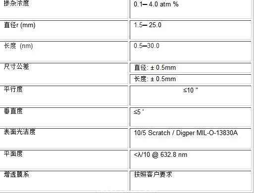 摻釹釩酸釔(Nd:YVO4)晶體是一種性能優良的激光晶體,適合制造激光二極管泵浦,特別是中低功率的激光器??梢灾瞥奢敵鼋t外、綠色、藍色到紫外線等類型的全固態激光器。