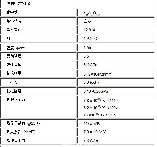 YAG晶體具有以下特點(diǎn): u無(wú)散射,無(wú)位錯(cuò) u穩(wěn)定的機(jī)械和化學(xué)性能 u熱傳導(dǎo)系數(shù)高 u無(wú)雙折射