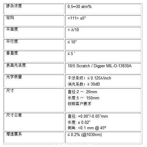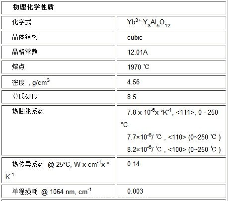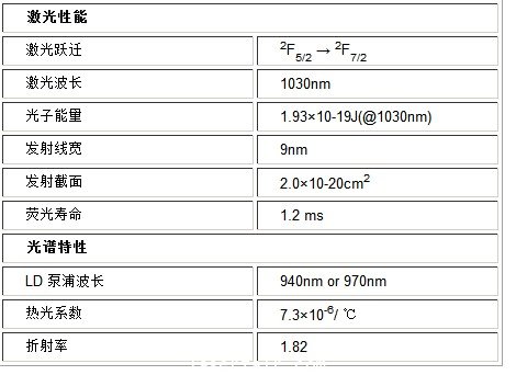 u光學品質優良 u斜率效率高 u激光上能級無激發態自吸收和上轉換 u吸收線寬 u熱導性能和機械性能好 u能方便的用InGaAs二極管泵浦