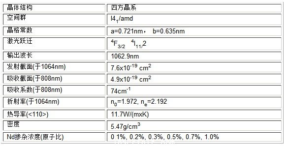 摻釹釩酸釓晶體(Nd:GdVO4)是和摻釹釩酸釔單晶(Nd:YVO4)性質相近的優秀的激光晶體,具有優良的物理、光學、機械性能,是理想的激光二極管泵浦全固態(DPSS)微小型激光器的激光工作物質之一。它比Nd:YAG有更高的斜率效率,比釩酸釔有更好的熱導和高輸出功率,故在高功率DPSS場合,使用Nd:GdVO4的效果會比使用Nd:YAG和Nd:YVO4更好。