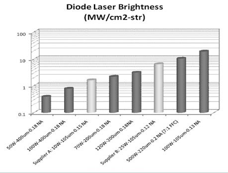 圖2.二極管激光器亮度(MW/cm2-str)為各種各樣的二極管激光器模塊。亮度超過18MW / cm2-str已經達到了使用nLIGHT的PearlTM生產線的水平。