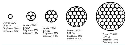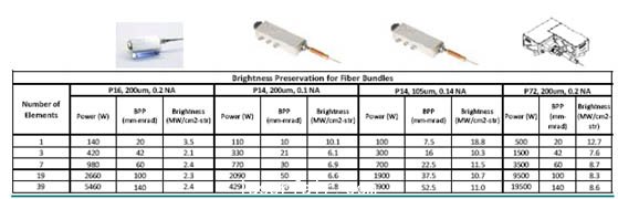 圖8 .根據功率現有的產品空間,BBP和亮度對光纖包捆激光模塊。選擇光束資源的靈活性和光纖數量包捆提供了高靈活性光纖耦合激光模塊。廣泛的產品都可以用這個方法解決。