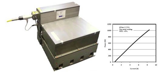圖6 .(左)一個KW-class二極管激光器系統以單一輻射源為基礎。該裝置利用波長光束組合達到1000 W的輸出功率為400微米,0.2MA的光纖。(右)模塊的光與電流曲線。