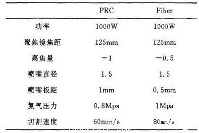 表3為光纖激光器與PRC 激光器對于1.5mm厚不銹鋼板(1Crl8Ni9Ti)切割參數的比較。
