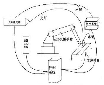 機器人光纖激光加工系統組成如圖2所示,主要是由光纖激光器、機器人(本體和控制柜)、水冷系統、光束傳輸系統、激光頭和工件裝夾系統組成。