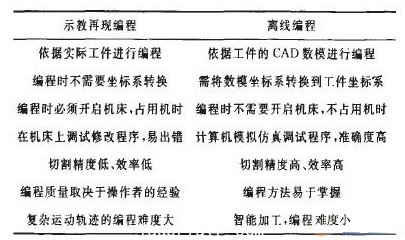 機器人離線編程系統是利用計算機圖形學的成果,建立起機器人及其工作環境的幾何模型,再利用一些規劃算法,通過對圖形的控制和操作,在離線的情況下進行軌跡規劃。通過對編程結果進行三維圖形動畫仿真,以檢驗編程的正確性,最后將生成的代碼傳到機器人控制柜,以控制機器人運動,完成給定任務。示教再現編程與離線編程的比較見表2。