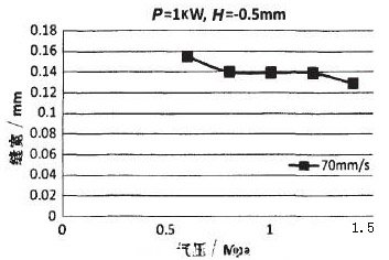 從圖7可以看出,隨著氣壓的增大,切縫寬度緩慢遞減,這是由于在切割過程中,高壓氣體把熔融狀態的金屬吹出,達到切割的目的,吹除過程中伴隨著能量的流失,達到對板材的冷卻作用,隨著氣壓的增大,冷卻的速度也隨之增大,熔化層再固化加快,割縫隨之緩慢減小。