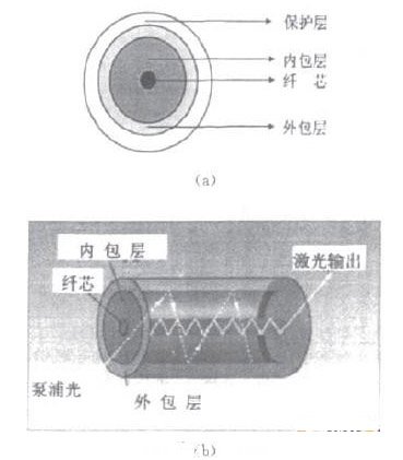 圖1是雙包層光纖截面結構及其工作原理圖。從圖1(a)雙包層光纖的截面結構町見,光纖包括四個部分:纖芯、內包層、外包層、保護層。用分別表示雙包層光纖的纖芯、內包層、外包層和保護層的折射率,則折射率應滿足:。