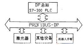 激光柔性加工系統一般包括控制用計算機或者PLC、激光器、機械運動裝置或機器人、光纖傳送和光束變換裝置及其它輔助設施。這是一種相對設備不多,但對其精度、實時性、安全性、集成度要求較高的精密控制系統,系統的組成如圖3所示。為避免使用造價昂貴的控制硬件,激光器的控制采用西門子S7—300 PLC作為控制終端,機器人采取串口通信方式。