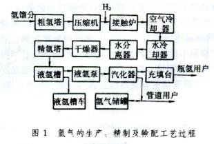 生產工藝流程 從空分設備的主精餾上塔適當部位抽出富氬餾分(其中含氬8%~10%,其余為氧及氮)引入粗氬塔,在粗氬塔中精餾后得到氬含量約為95%的粗氬。粗氬出粗氬塔后經加壓送入接觸爐,入爐前加入適量氫氣,在爐中催化劑的作用下,粗氬中的氧與氫化合生成水,同時產生大量熱量。出爐的灼熱氣體經冷卻、水分離及干燥后,送往精氬塔,在精氬塔中將氬中的氮除去,塔底得到99.99%或更高純度的液態純氬產品并經管道導至儲槽。另外。20世紀80年代在空分設備上已有只用精餾,不需用氫氣除氧生產精氬的設備。產品氬的輸配,一般有三種型式:(1)液氬經低溫泵加壓到1.5~3.0MPa,再經汽化器汽化后由管道輸往用戶,管路中設置氣體儲罐以調劑負荷波動。(2)液氬從儲槽直接裝入低溫槽車運往用戶。(3)對不固定的零星用戶及向市場供應,氣態氬用膜式壓縮機,液態氬用高壓低溫泵加壓到15MPa汽化后去充填臺充瓶供應。
