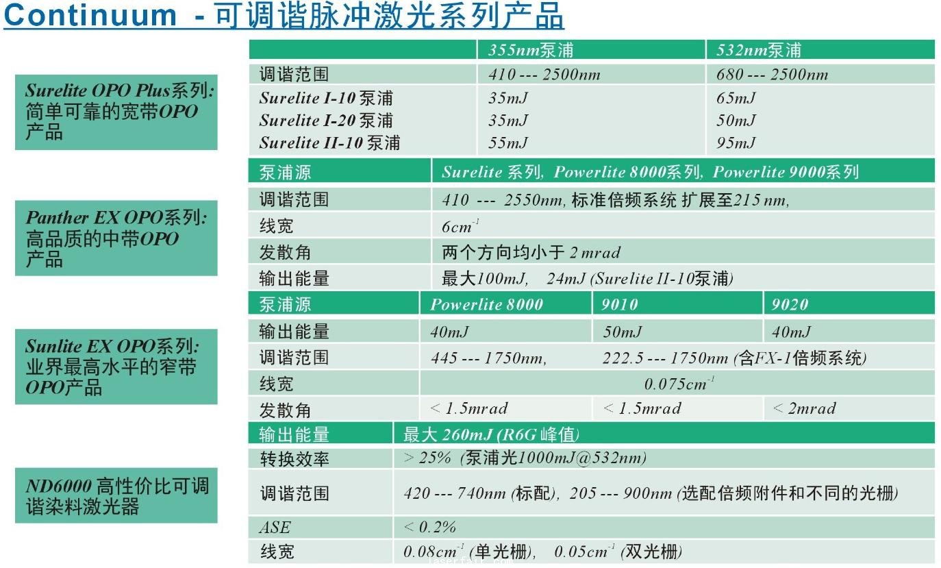從寬帶Surelite OPO plus 到中帶Panther EX OPO 到獨有的窄帶Sunlite EX OPO Continuum提供全系列光學(xué)參量振蕩器(OPO)產(chǎn)品。對應(yīng)紫外可見波段的用戶,還有超低熒光的脈沖染料激光器可供選擇。