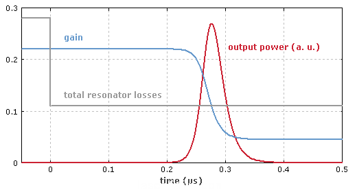 有趣的是,調制器的切換時間不需要和脈沖持續時間一致,可以比這長很多的時間,因為它需要諧振腔往返許多次去形成強脈沖。但是如果太長,這又可能導致雙脈沖或一定的不穩定性。