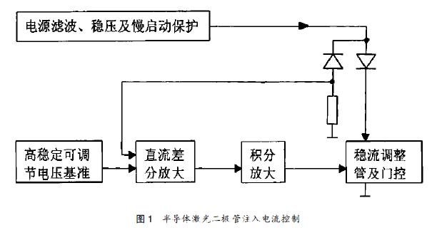 半導體激光二極管工作電流( 注入電流) 調節與穩流控制基本原理如圖1 所示。該電路采用可調節基準電壓與激光管輸出功率( 與輸出波長相對應) 的反饋電壓相比較來實現激光管工作電流的調節與穩流。高穩定可調節基準電壓由精密電壓基準LM399 經線繞多圈電位器粗/ 細調提供; 反饋電壓則取自由激光管內置光電二極管輸出的功率監測電流流經取樣電阻上的壓降。此兩路電壓信號分別輸入至直流差分放大及積分放大, 然后控制穩流調整管的門。由該門調整連續流經激光管上的電流。對光源工作波長的掃描與調制一般是采用對激光管工作電流進行掃描和調制。因此, 在該注入電流穩定的積分放大部分設有掃描和調制信號的輸入。
