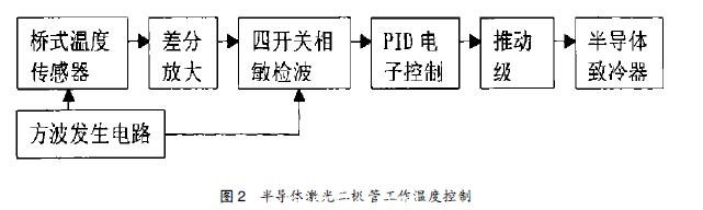 激光二極管工作溫度的設置與恒溫控制如圖2 所示。其基本工作部分為: 由橋式溫度傳感器設置及探測激光管工作溫度變化, 并將測到的溫差信號轉變為電壓信號, 經差分放大,PID ( 比例 積分 微分) 控制器至驅動電路控制半導體致冷器加熱或致冷。為提高電路精度, 在基本部分基礎上加設了鎖相放大部分, 該部分由方波發生電路及四開關相敏檢波放大組成。半導體激光二極管工作電流及工作溫度控制的具體電路見。