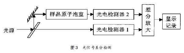 對光信號的差分檢測采用圖3 所示的方式。將由光源出射的光分為兩束, 一束直接進入光電檢測器1; 另一事則經過待探測的原子泡室后再進入光電檢測器2, 所得兩路光電信號分別輸入到差分放大器, 適當調節兩組信號的強度比例, 則基本可去除四對激光管工作電流掃描引起的輸出信號上的傾斜功率背景。