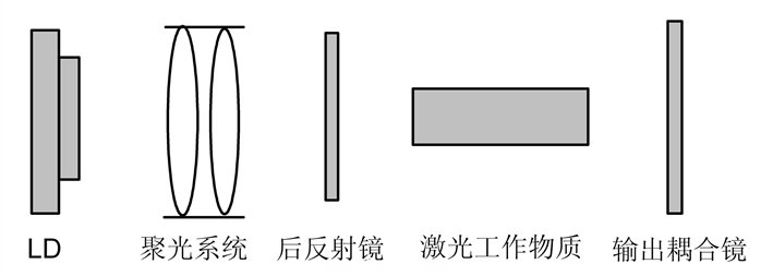 不論是三能級系統還是四能級系統,要使激光材料發射激光,第一步都需要泵浦源給予足夠強的激勵,使之成為光的增益介質。半導體激光器(LD)泵浦是當前用于激勵激光材料的一種高效而又不會產生太多熱量的泵浦方法,它不會因為熱量的產生而導致激光材料的溫升太大,從而較好的保持激光材料在較低溫度下的優良性能。圖2為LD泵浦的固體激光器示意圖。