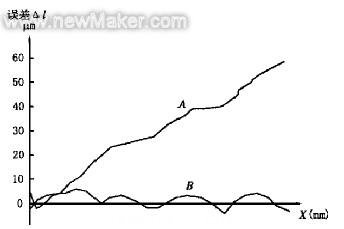 對一臺型號為YCM-VMC-65A的加工中心的的X軸定位誤差進行檢測,補償前后誤差曲線如圖3所示。補償前其X軸定位誤差曲線為A,最大誤差為57 6μm,經過補償后,其X軸定位誤差曲線為B,最大誤差僅為6 6μm。