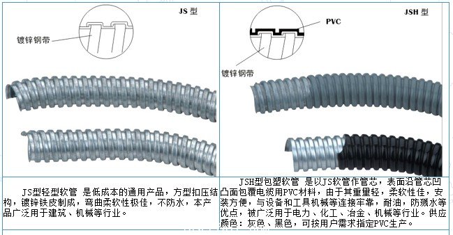 JS型輕型軟管 是低成本的通用產(chǎn)品,方型扣壓結(jié)構(gòu),鍍鋅鐵皮制成,彎曲柔軟性極佳,不防水,本產(chǎn)品廣泛用于建筑、機(jī)械等行業(yè)。 JSH型包塑軟管 是以JS軟管作管芯,表面沿...