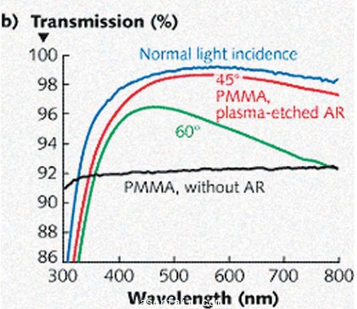 圖4:對(duì)聚合物材料如有機(jī)玻璃(PMMA)進(jìn)行直接等離子體刻蝕,創(chuàng)建出亞微米級(jí)的表面結(jié)構(gòu)(a),以此作為防反射膜(b)。