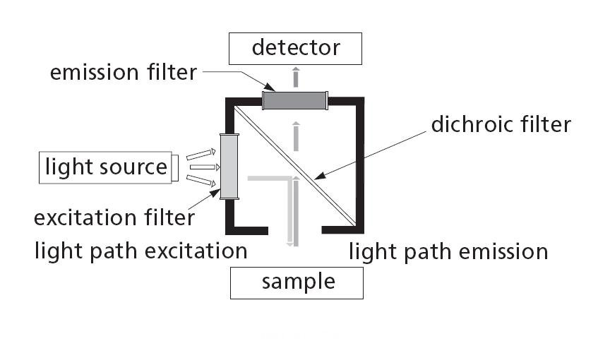 CVI Melles Griot 提供熒光顯微專用濾光組件,其中包含兩片濾光片及一片二向色鏡 熒光顯微濾光組件(含二向色鏡)的結構圖如下: