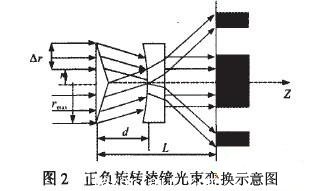當(dāng)正負旋轉(zhuǎn)棱鏡及球面透鏡相結(jié)合,可實現(xiàn)多種光束的變換。如圖2所示,采用正錐棱鏡在前,負錐棱鏡在后的組合方式。該組合系統(tǒng)中兩正負棱鏡具有相同的錐角和折射率。在理論上具有嚴格的耦合特性。一束經(jīng)過準直系統(tǒng)后的激光束入射到正錐棱鏡,光束發(fā)生偏折,而后經(jīng)過與正錐透鏡距離為的負錐棱鏡,其出射光束的形狀和能量分布隨著d的變化而發(fā)生變化。
