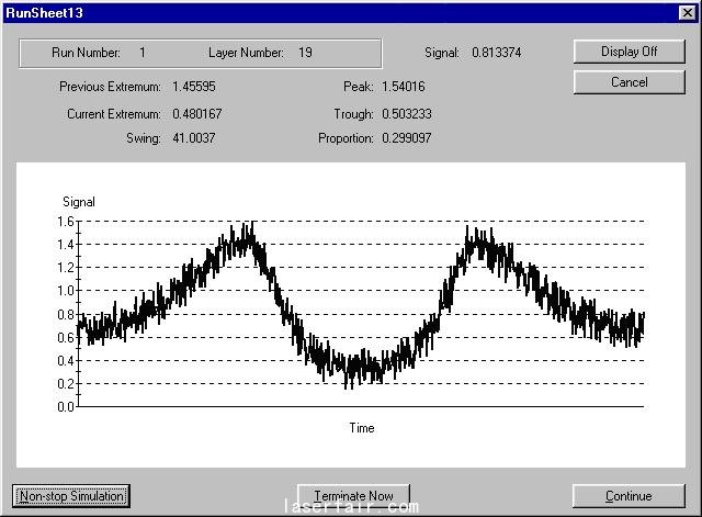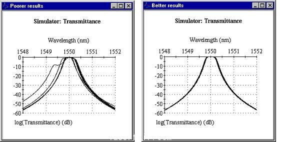Simulator比簡單的監控問題回答得更多。所有與薄膜系統有關的其它的參數都可以轉換成檢查模擬和它們影響的參數。Simulator的結果顯示,在沒有改變系統中噪聲或精度時,某一膜層的監控過程中的一個小小改變,對DWDM應用的多腔分束器的設計中,能否引起實質性的改進。