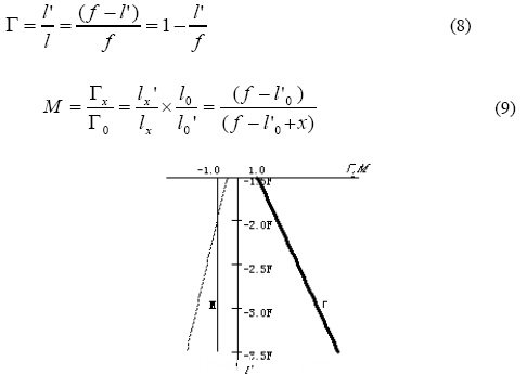 5) 在像面位移的極值點,物象放大率等于-1(m=-1),物面在極值點和變焦組之間,物像放大率絕對值大于1(abs(m)>1),在l=-f處m=∝;物面位置在無窮遠和像面位移極值點之間物像放大率絕對值小于1(abs(m)<1)。在l=∝處m=0。