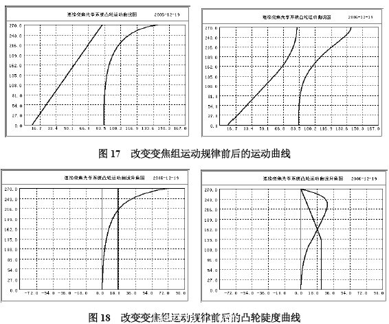 4) 改變變焦組運動規律改善補償組補償環境 補償組用來補償變焦組形成的像面位移的能力也是有限的,特別對于一些大變焦比系統,如果其變焦組與補償組的匹配方案不是很合理的情況下更顯突出。為了緩解補償組的補償壓力,有時也不得不求助于變焦組的努力。這就是改變變焦組運動規律改善補償組補償環境的方案。比如同一個變焦系統,在改變成曲線運動規律后的變焦組和補償組的運動曲線如圖17,他在改變了運動規律后凸輪曲線的陡度如圖18。由此可以清晰看出,改變前凸輪曲線最大陡度可達70°之多,造成凸輪運動卡死,簡直無法使用,而把變焦組的運動規律略加修改就可把凸輪曲線的最大陡度改善到30°以內,明顯提高了變焦系統的運動性能。