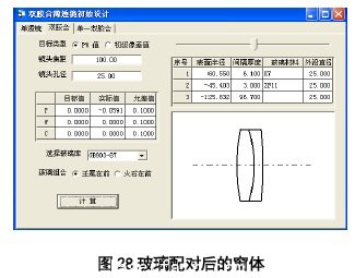 玻璃配對完成后,就可根據系統對透鏡的要求自動計算出透鏡的PW值以及透鏡結構參數,并列于表中,同時還顯示出透鏡的結構示意圖,如圖28。