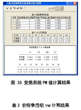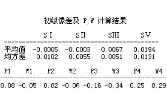 前面求出了滿足像面補償以及焦距變化范圍等要求的焦距分配,接著便要考慮校正像差的問題。由于變焦系統比較復雜,應把校正系統像差的工作分成兩個階段進行,也就是首先考慮系統初級像差的校正,然后再考慮初級像差和高級像差的平衡。當然這兩個階段也不能截然分割開來,比如在校正初級像差時還必須要考慮系統可能產生的高級像差預留一部分初級像差等待和高級像差平衡。 連續變焦系統和定焦距系統的關鍵不同還在于,定焦距系統的所有鏡片和透鏡組的結構參數在使用中都是固定不變的,而連續變焦系統的各個固定組和活動組之間間隔會在變焦過程中不斷變化,其像差關系也在不斷變化。因此,對變焦系統不僅要考慮像差的最佳性同時還要考慮其像差的穩定性。為了滿足變焦系統最佳性和穩定性的要求,為簡化對系統像差的要求,可以把整個變焦過程的所有像差集合起來求其平均值和其均方差表達像差的最佳性和穩定性指標。此外,在考慮系統初級像差的校正時要選取兩個中間參數P、W值(通常簡稱PW值)作為求解系統結構參數的必要參數。因此求解PW值的過程就是根據校正初級像差求解系統結構參數的過程。在校正初級像差求解PW值的過程中,可以把在變焦過程中所有各像差系數的加權平均值和均方差值(離散值)集合起來以它們為目標值構造評價函數,使用最小二乘法求解PW值。使用OCAD程序自動計算高斯光學外形尺寸后,接著使用“下一步”按鈕,就可以根據對系統初級像差系數的要求再加上對各組分PW值的權系數自動計算出各組分的PW值如圖25。表2列出的數據是圖25中數據的列表。由計算窗體上可以看出,在填寫初級像差系數時,要求填寫各像差系數的平均值和離散值及其公差內容。對各種初級像差系數的選擇可以通過窗體上的工具條取舍,通常各組分的色差都有各組分單獨消除,一般不需要自動平衡色差系數CⅠ和CⅡ。對像差系數平均值的要求可以控制系統的平均值,但不是最佳值,對其最佳值的控制用其離散值的要求保證。