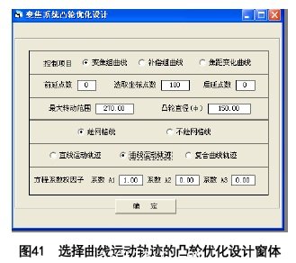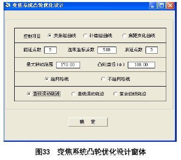 OCAD可以對三組元連續變焦系統進行凸輪優化設計,在輸入三組元連續變焦光學系統的數據之后可從工具條的“設計”中選擇“變焦系統凸輪優化設計” 菜單,界面上出現小窗體如圖33。