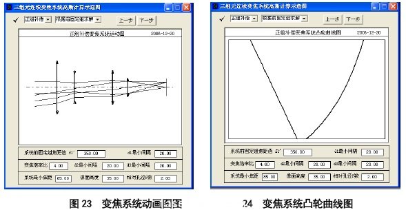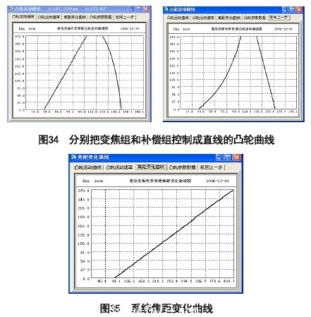 如果選擇“動畫”可以以動畫形式生動地顯示系統變焦過程如圖23。如果選擇“凸輪”就可以顯示該系統變焦組和補償組的凸輪曲線圖如圖24。在OCAD光學設計程序內顯示的圖形都是彩色圖形,有時為了具體需要可以任意修改圖形顏色的背景色或前景色,只要選擇工具條內的“顏色”即可實現。