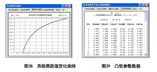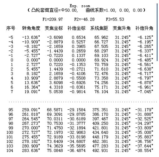 在圖36中,縱坐標為轉動角度,為便于工藝需要以角度(°)為單位。橫坐標為變焦組和補償組的沿光軸方向移動量。圖37中,橫坐標為變焦組和補償組的運動曲線的斜率值。因變焦組為直線,其斜率(陡度)僅與凸輪運動范圍的總弧長和變焦組總移動量有關,其斜率值為常數。因補償組運動曲線為一曲線,其各點斜率就是在該點處曲線的微分變化量。圖38中,橫坐標為系統在變焦過程中不同變焦位置的實際焦距值。圖39中,給出了凸輪曲線的全部數據,其中包括變焦組和補償組的以變焦起點為坐標原點的坐標值,各對應點的系統焦距值以及變焦組和補償組的曲線升角(曲線陡度),詳細數據可以通過文本框的滾動條閱讀。為了加工方便往往需要在曲線數據兩端多加幾個坐標點作為加工余量,可以在填寫數據時填寫需要前后延伸的加工點數(見表4)。在表中可以看到,計算的100個坐標點中,在前面插入了5個前沿坐標點(從-5到-1),在100個點后又增加了5個后伸點(從100到104)。表4 凸輪曲線設計數據