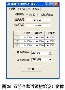 一般說來系統的復雜化過程就是把最原始的單透鏡或雙膠合透鏡分成一組或多組的排列,比如可以把他們分配成單透鏡——雙膠合透鏡組合、兩個雙膠合透鏡組合、兩個單透鏡和一個雙膠合透鏡組合甚至還可能需要分解成更多的鏡片的組合才能滿足要求。具體復雜化方法在許多文獻[2]上都有很具體的分析,可借鑒參考。無論把一個組分復雜化成什么程度,其最基本的單元都離不開單透鏡或雙膠合透鏡。因此,初始結構的設計最終還是可以歸納為對單透鏡和雙膠合透鏡的設計。把一個組分的PW值分解成各個單透鏡或雙膠合透鏡后,很容易使用OCAD光學設計程序求解具體結構參數。在OCAD中有專門的自動求解雙膠合透鏡的工具菜單。在選擇“薄透鏡初始結構設計”菜單后,程序界面上會出現如圖26窗體。