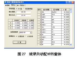在圖26中要求填寫透鏡的焦距、孔徑、系統對該透鏡PW的要求值,再選擇使用玻璃材料的玻璃庫名以及根據系統結構具體情況決定玻璃組合形式是王冕在前還是火石在前。然后點擊“下一步”健,程序自動按對P值精度的要求,自動求解滿足要求的玻璃配對,按P值的大小順序排列在表上,如圖27窗體,此時只要在表中滿足要求的一行上點擊即可選取玻璃配對。