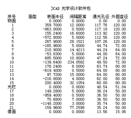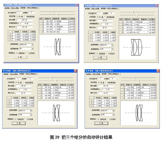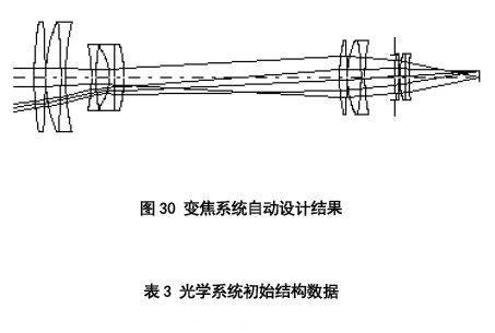雙膠合透鏡初始結構參數計算后,還可以根據透鏡的PW實際值和目標值對比,利用圖面上的調節桿對透鏡進行“彎曲”調整。如果還不能滿足設計要求,還可以使用“上一步”健返回到如圖26界面重新選擇玻璃配對,以求得到滿意結果。 根據表2列出的各組分PW計算結果,其中前固定組和兩個活動組可以先使用一個雙膠合透鏡,往往由于后固定組的像差負擔比較重,應該進一步復雜化成兩個雙膠合透鏡分擔PW的要求值。經OCAD自動計算系統中前三個組分的雙膠合透鏡的結構參數,如圖29所示。合起來全系統設計結果如圖30,其初始結構數據如表3所示。