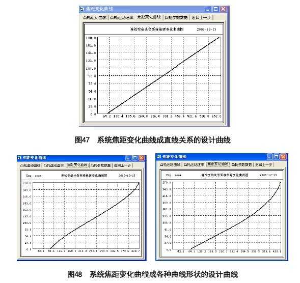 由圖46可以明顯看出,把變焦組運動曲線改為復合曲線后,在短焦部分的曲線斜率又有進一步改善。對于負組補償系統,變焦組由前向后移動時,系統焦距顯示長焦,然后逐步向短焦發展,如果需要改善長焦部分去銜接,可以讓計算過程由后向前計算,仍是先短焦后長焦,利用以上辦法改善短焦部分曲線斜率。反之,如果有以改善短焦部分曲線斜率,可以改變計算順序,利用復合曲線。改變計算順序很簡單,把變焦組的初始位置調整到長物距位置,向前運動,讓變焦組移動步長為負值即可。 圖47為控制系統焦距變化曲線成直線關系的設計曲線。也可以把系統焦距變化曲線按以上辦法調整成任意曲線方式如圖48。