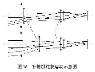 2) 以物面位移的極值點位置為轉折點往復運動方式 如圖16補償組往復運動的優點是補償組運動范圍小,系統結構緊湊,但從圖4可以看出,補償組在往復運動過程中,一段和變焦組作反向運動,另一段作同向運動。在做反向運動有利于變焦速度,而同向運動必然減緩變焦速度,使得變焦過程加長,降低變焦效果。