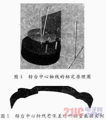 在系統(tǒng)設計過程中,轉臺中心軸線標定和多視拼合及重疊數(shù)據(jù)區(qū)域的處理是影響測量結果的2個重要因素,下面簡單介紹這兩部分的設計思路。4 轉臺中心軸線標定