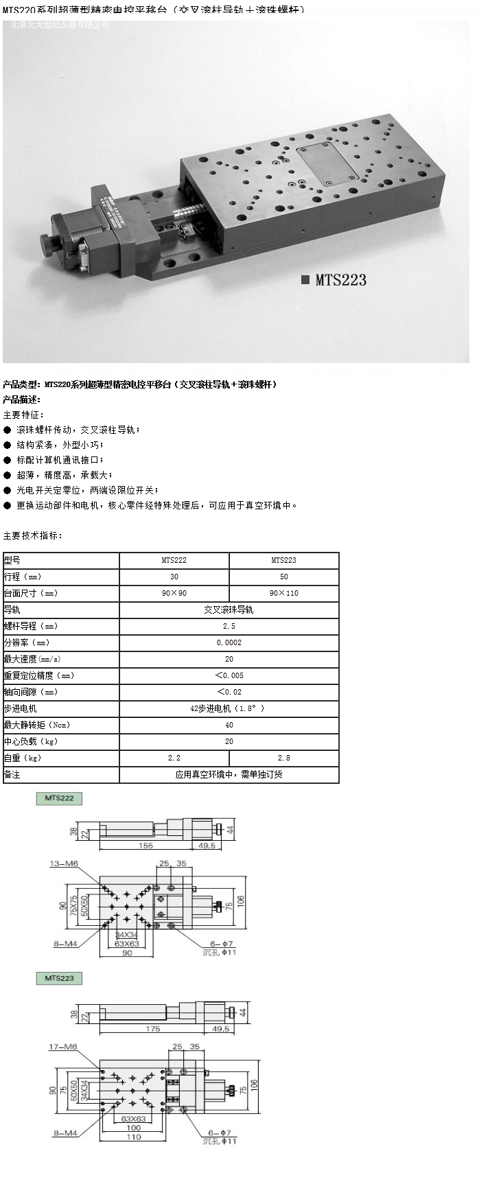 MTS220系列超薄型精密電控平移臺(交叉滾柱導軌+滾珠螺桿)